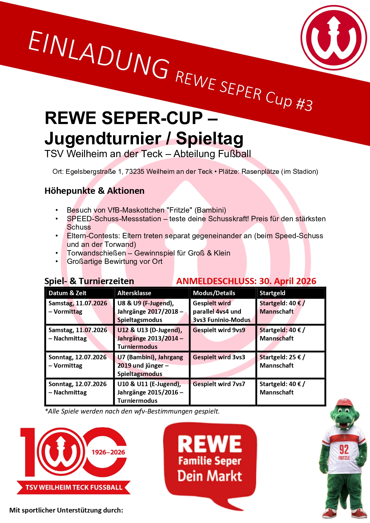 Am 11. & 12. Juli 2026 findet bei uns im Stadion wieder der REWE SEPER-CUP statt – ein riesiger Fußball-Spieltag für unsere Jugendteams! 💪